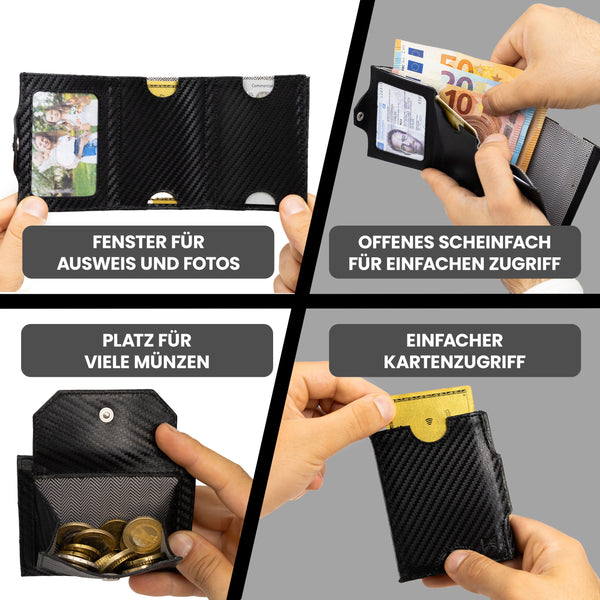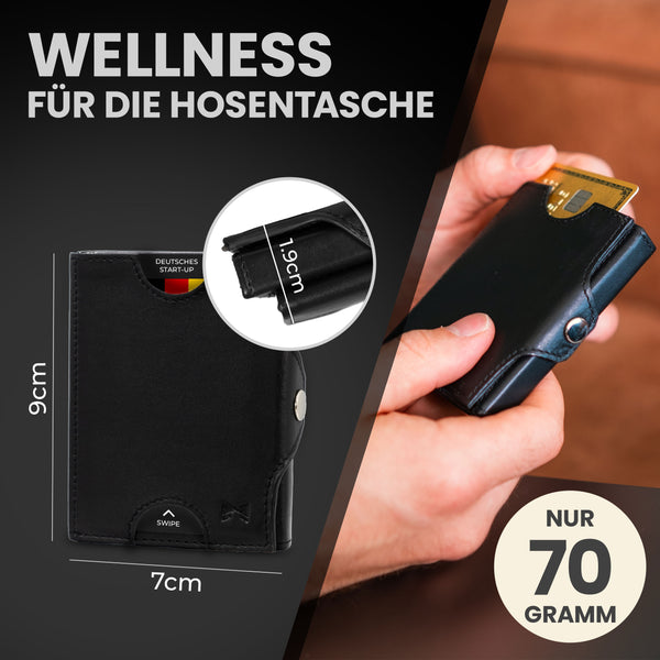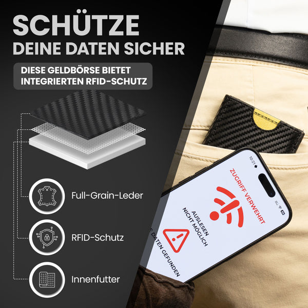 RFID-Schutz: Im Slim Wallet wird ein besonderes Innenfutter benutzt, welches RFID-Lesegeräte blockiert und somit deine Kreditkarten schützt.